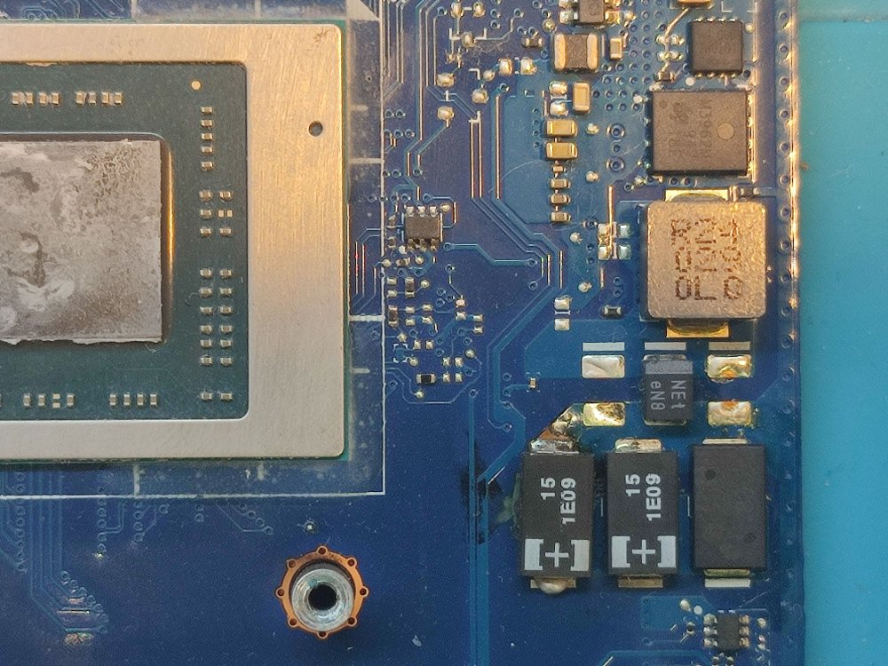 Dalsza, bardziej szczegóĹowa diagnostyka skupiĹa siÄ na analizie obwodów zasilania. Podejrzenie padĹo na sekcjÄ zasilania procesora (CPU). W nowoczesnych laptopach gamingowych sÄ to niezwykle zĹoĹźone i obciÄ Ĺźone ukĹady, odpowiedzialne za dostarczanie stabilnego i precyzyjnie regulowanego napiÄcia do CPU. Nawet niewielkie uszkodzenie w tym obszarze, spowodowane przez korozjÄ, mogĹo prowadziÄ do obserwowanych problemów.